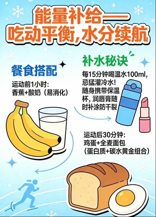 冬日已至,校园银装素裹,冰雪活动正当时!为保障大家在极寒天气中科学锻炼、安全运动,公共体育教研室特送上这份“暖冬指南”,助你畅享冰雪乐趣,健康度过寒冬!