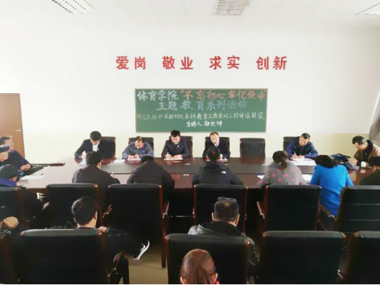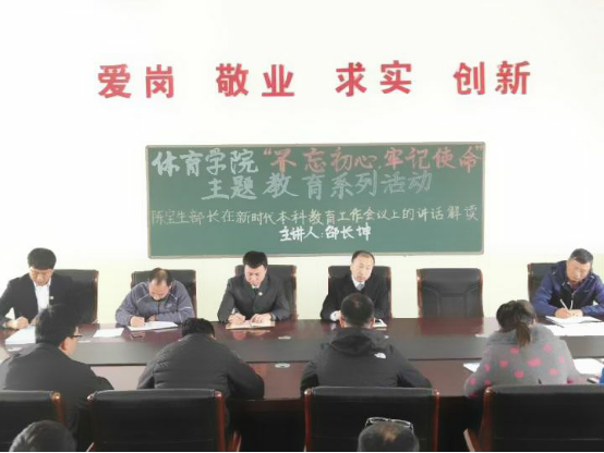 best365中国官方网站于2018年10月10日下午2点,在安保处二楼会议室召开best365中国官方网站“不忘初心、牢记使命”主题教育系列活动,传达解读陈宝生部长在时代本科教育工作会议上的讲话,本次活动由best365中国官方网站经理兼党总支书记邵长坤主持,出席的人员有体院学院全体教师。