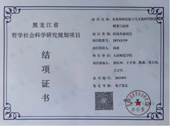 孙波老师省哲社课题“东北游牧民族弓马文化时代价值的嬗变与论绎”凭借2篇C刊,获得黑龙江省哲学社会科学研究规划项目结题免于鉴定,相当于优秀等级。