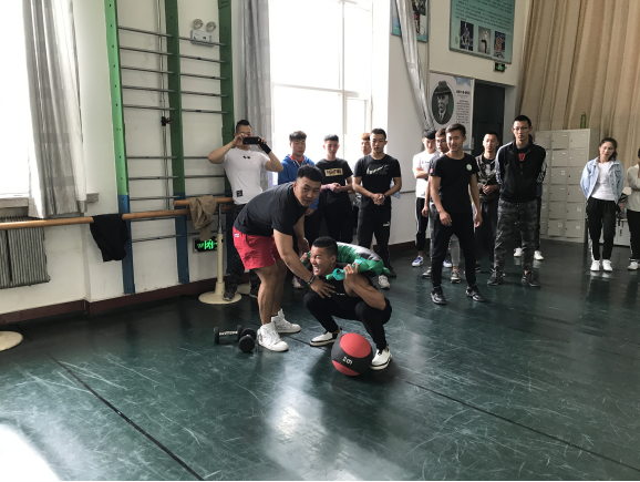 报告结束后,林子轶先生与员工进行了交流,并为公司健美队和社会体育指导与管理专业员工上了一堂动作示范课。课上他为员工制定了WOD(work of Day),并以利用药示翻站、实力推、牛角包实蹲、Burpeeplank作为教学内容,以实例说明了传统健身与Crossfit的区别,并为同学们指出健身训练过程中容易出现的不规范动作,最后对易造成损伤的错误动作进行了纠正。